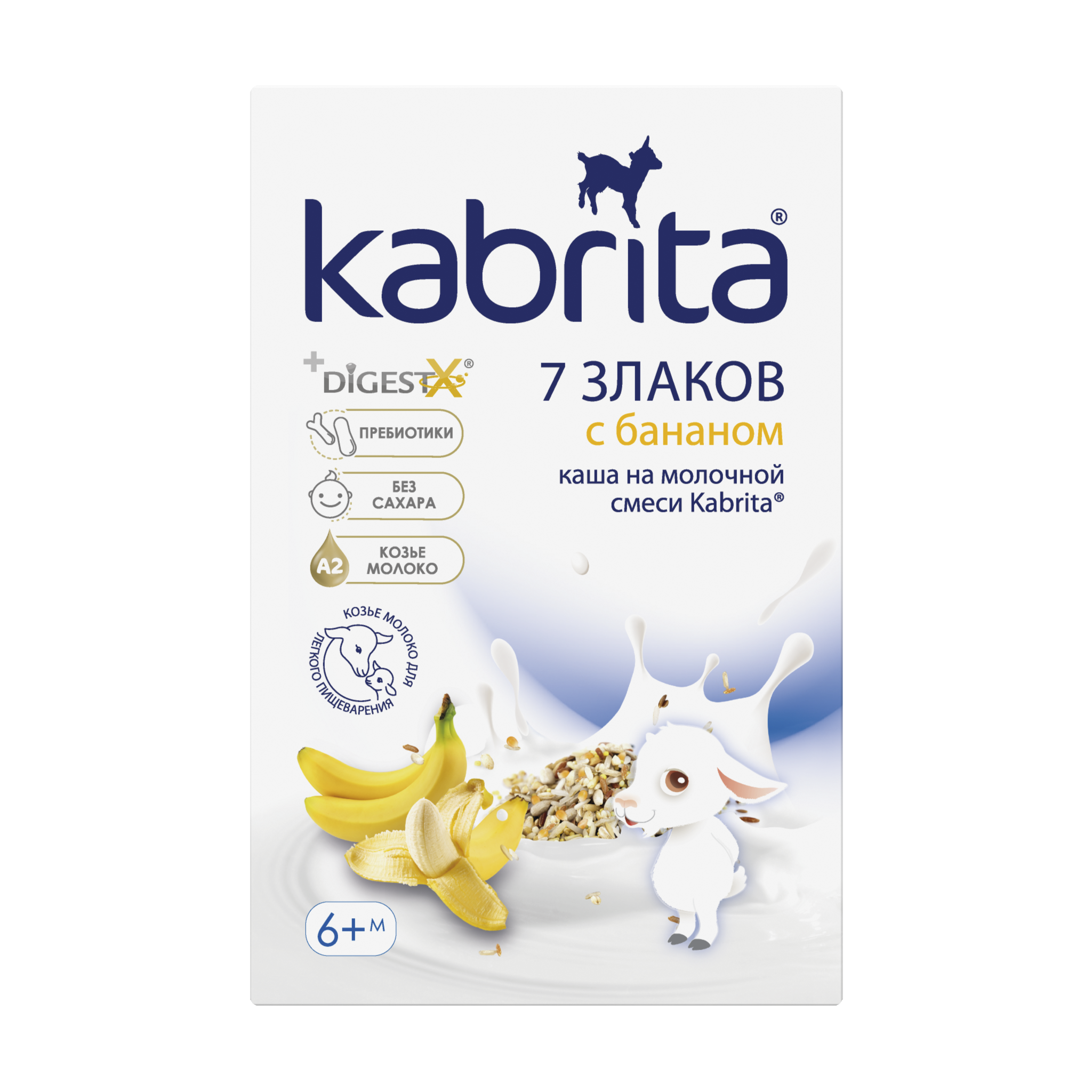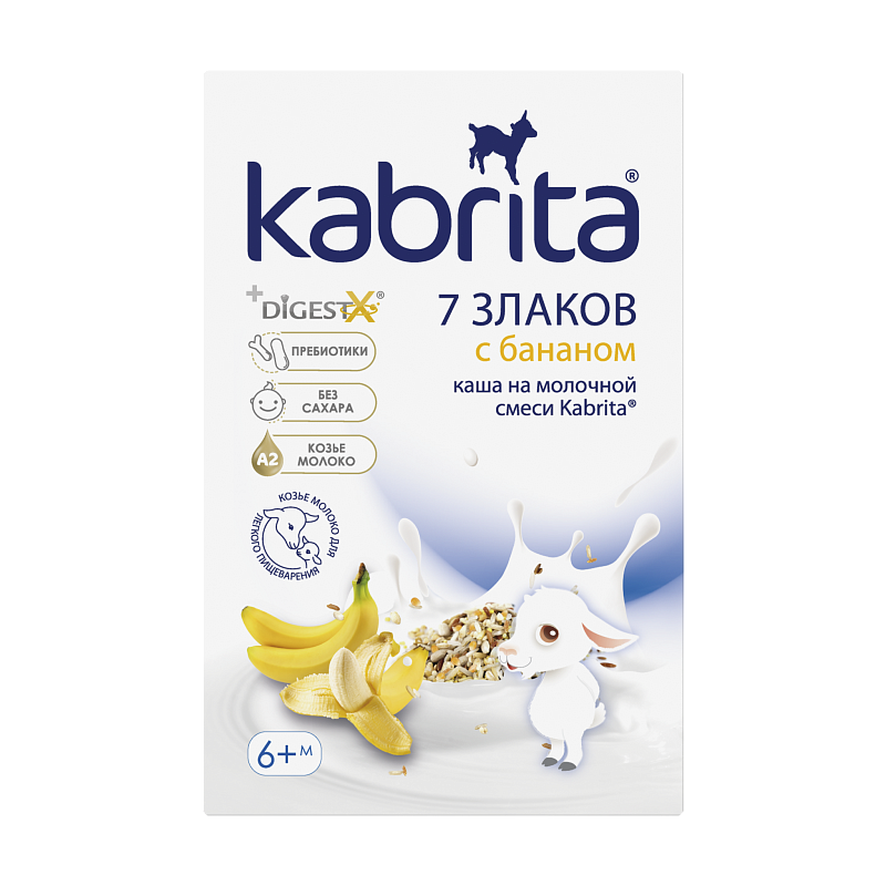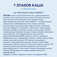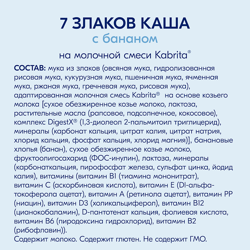 Мука из злаков (рис, гидролизованный рис, овес, цельная пшеница, кукуруза, ячмень, рожь, просо), адаптированная молочная смесь Kabrita® на основе натурального козьего молока (обезжиренное сухое козье молоко, растительные масла (комплекс DigestX – 1,3-диолеол 2-пальмитиол триглицерид рапсовое, пальмовое, подсолнечное масла), соевый лецитин, лактоза, концентрат сывороточных белков козьего молока, гидроксид калия, хлорид магния, L-таурин, холина хлорид), фрукты (натуральные банановые хлопья), пребиотик фруктоолигосахарид (FOS - инулин), минеральные вещества, витамины.