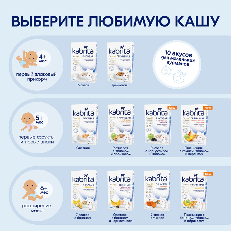 Технология «бережного расщепления зерна» облегчает пищеварение, позволяет сохранить естественную сладость злаков. Благодаря этой технологии каши Kabrita имеют воздушную, нежную структуру и идеально разводятся в воде.
