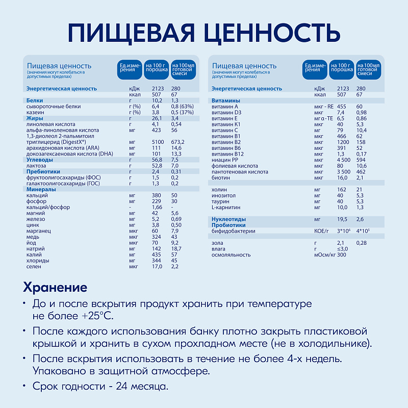 Хранение: до и после вскрытия продукт хранить при температуре не более + 25°. После каждого использования банку плотно закрыть пластиковой крышкой и хранить в сухом прохладном месте (не в холодильнике).