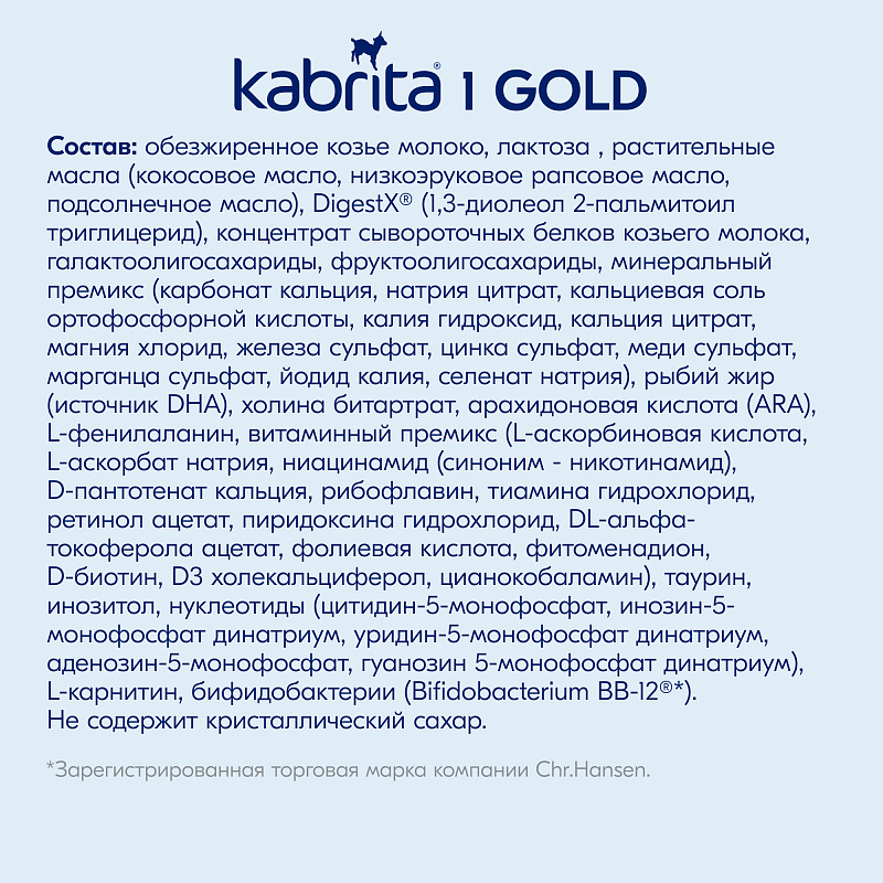 Обезжиренное козье молоко, лактоза , растительные масла (кокосовое масло, низкоэруковое рапсовое масло, подсолнечное масло), DigestX (1,3-диолеол 2-пальмитоил триглицерид), концентрат сывороточных белков козьего молока, галактоолигосахариды, фруктоолигосахариды, витаминно - минеральный премикс, рыбий жир (источник DHA), холина битартрат, арахидоновая кислота, L-фенилаланин, таурин, инозитол, нуклеотиды, L-карнитин, бифидобактерии (Bifidobacterium BB-12*). Не содержит кристаллический сахар.