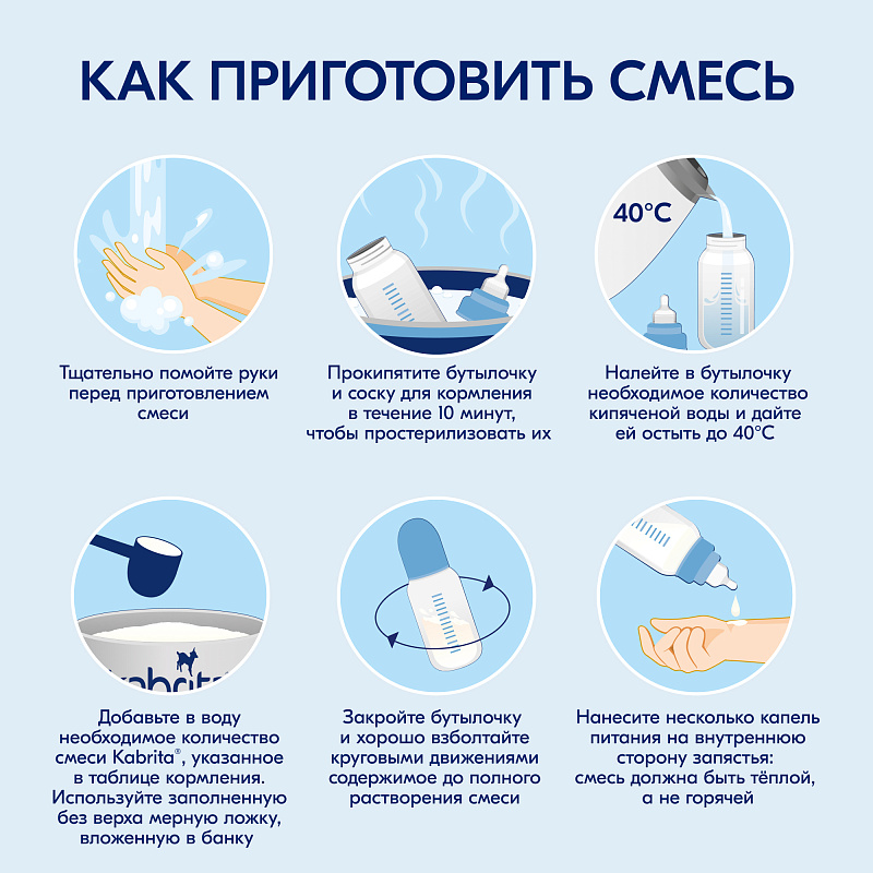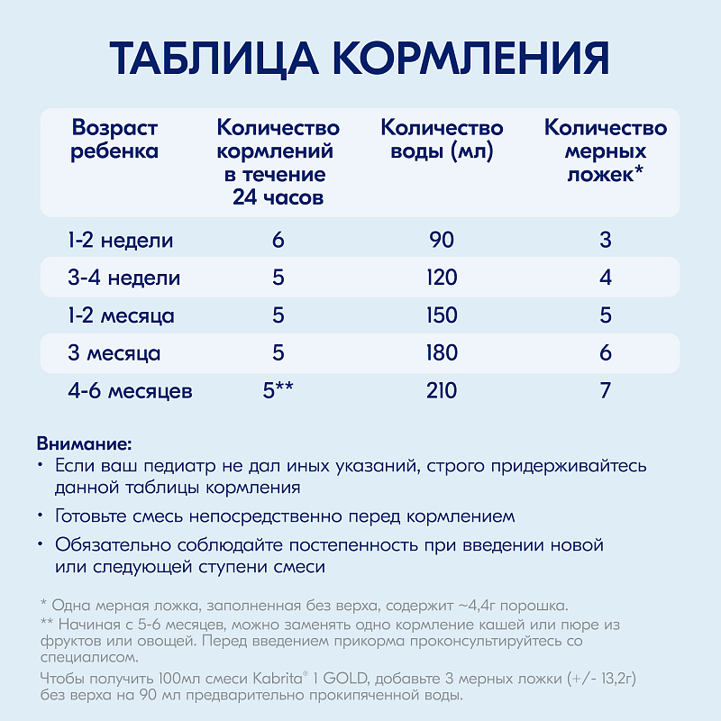 3.Добавьте в воду необходимое количество порошка Kabrita® 1 GOLD, указанное в таблице кормления на упаковке продукта. Используйте заполненную без верха мерную ложку, вложенную в банку.