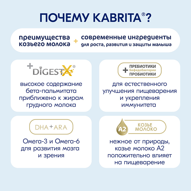 DigestX – комплекс жиров с бета-пальмитатом, подобный жировому профилю грудного молока, способствует снижению вероятности запоров, лучшему энергообмену и усвоению кальция.